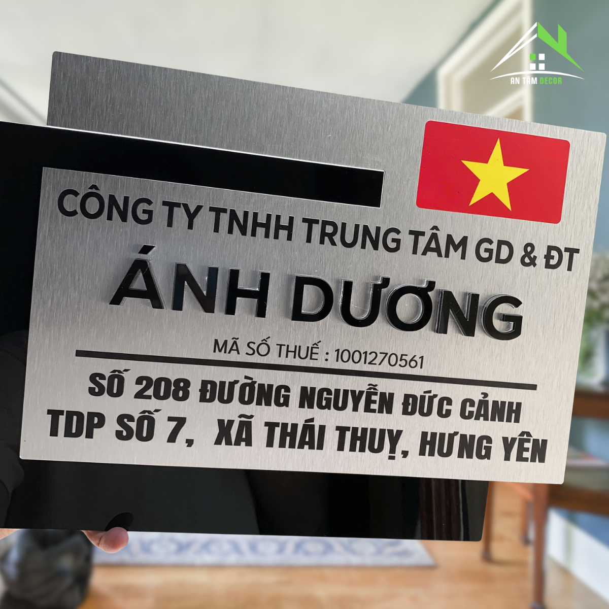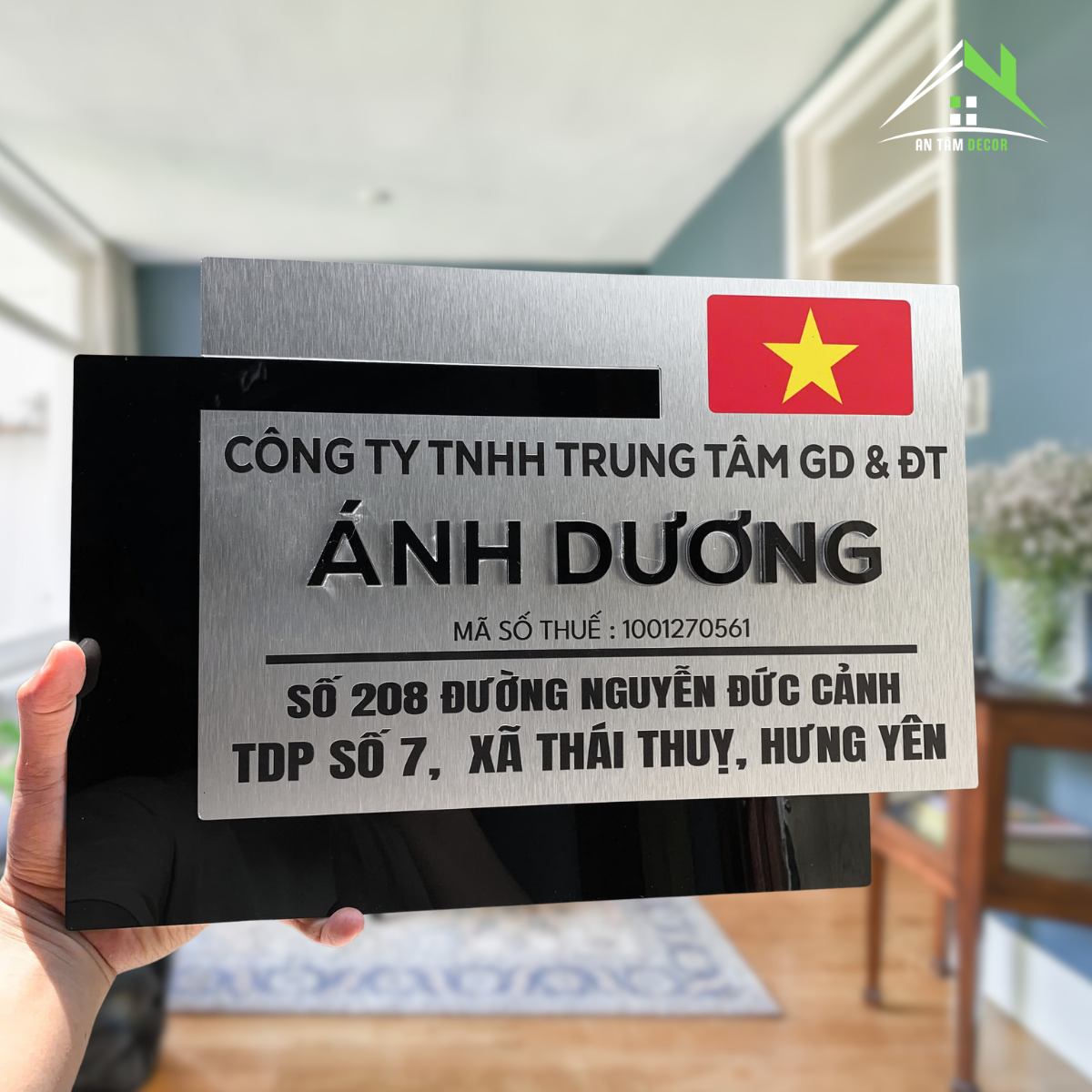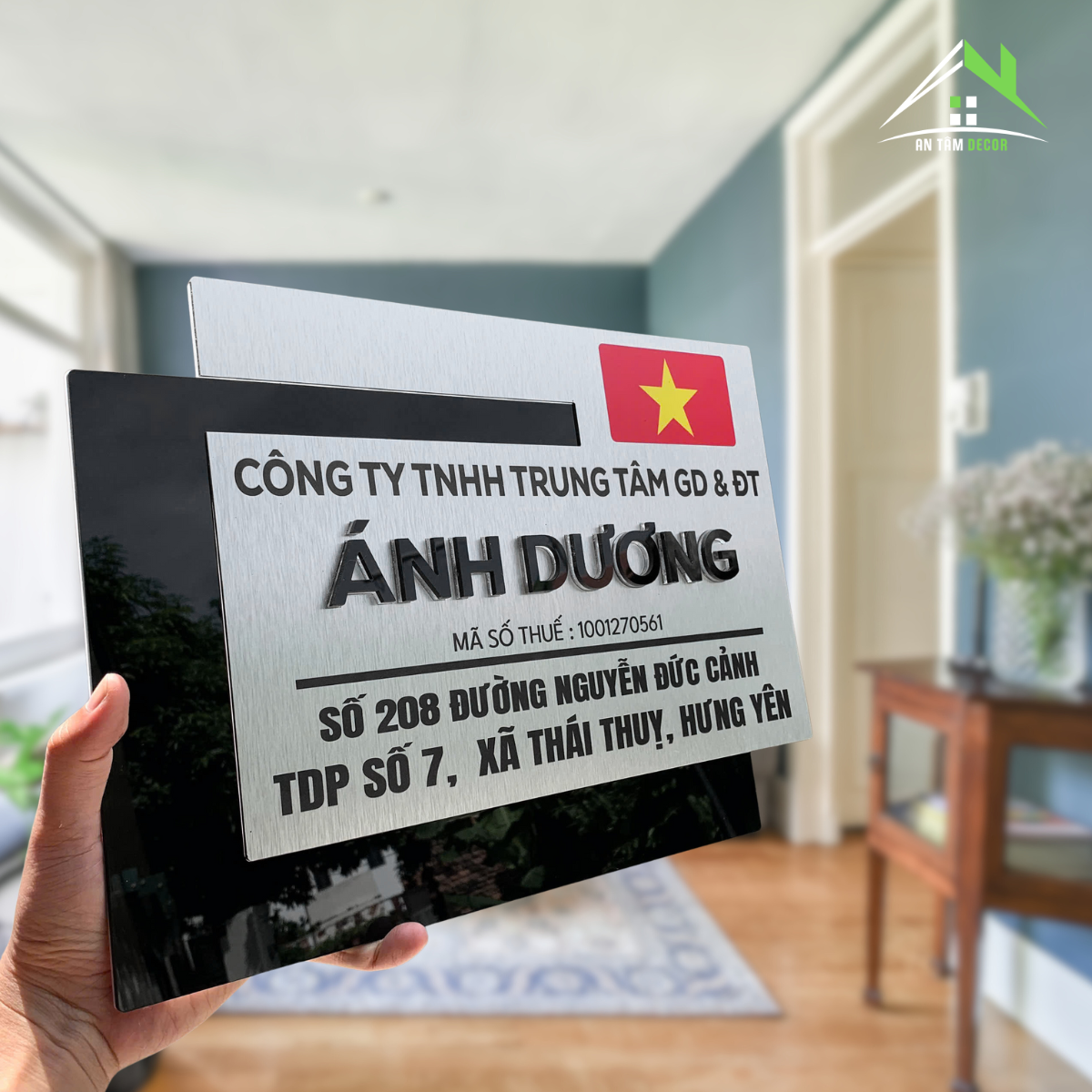 • Kích thước và hình dáng: Thiết kế hình chữ nhật hiện đại, kích thước chuẩn cho biển công ty, dễ dàng lắp đặt tại cửa ra vào, văn phòng hoặc showroom.