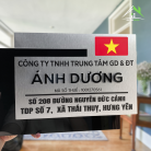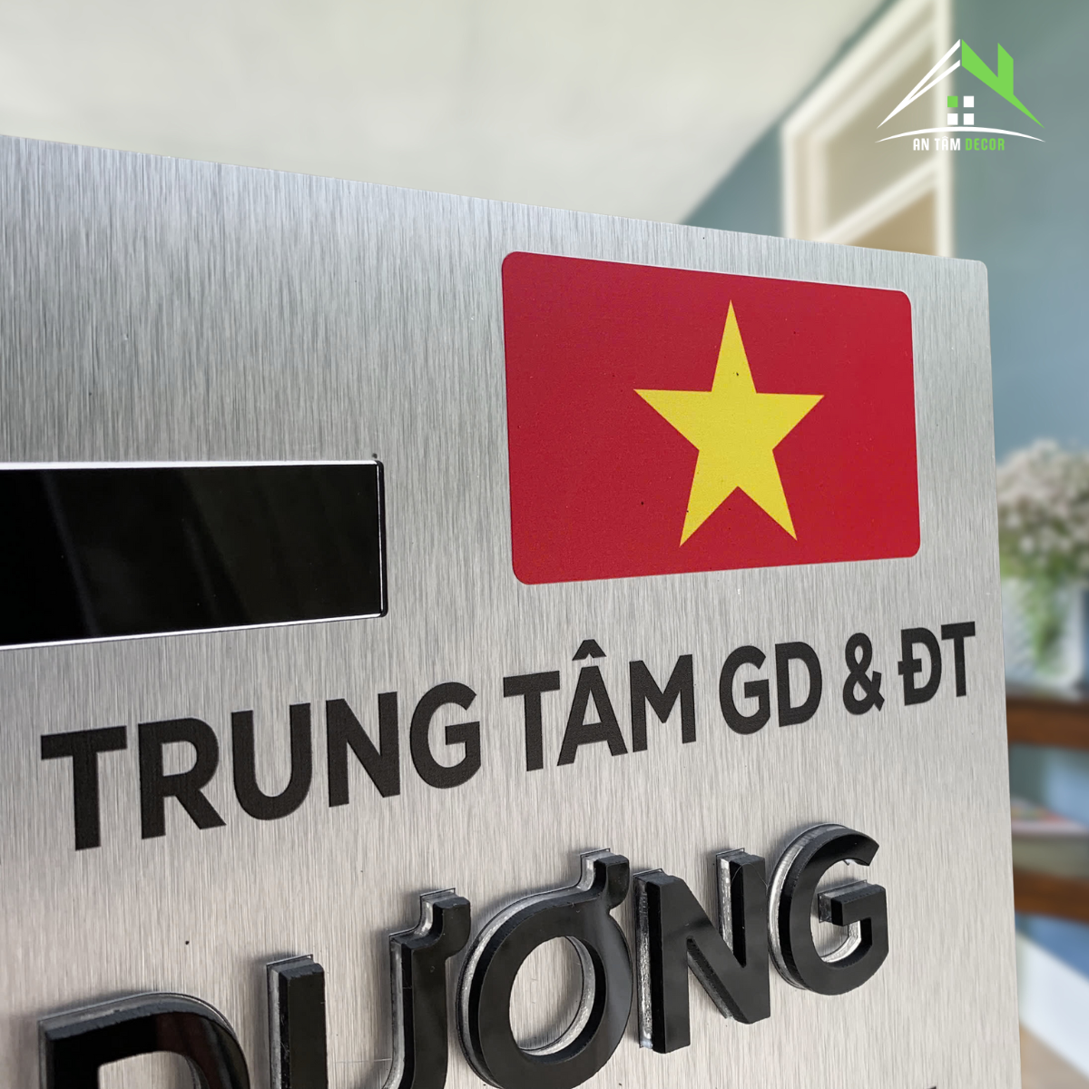 • Thiết kế & phong cách: Nền inox xước bạc sang trọng, chữ nổi đen sắc nét, điểm nhấn lá cờ Việt Nam in UV rực rỡ, thể hiện niềm tự hào dân tộc và phong cách chuyên nghiệp.