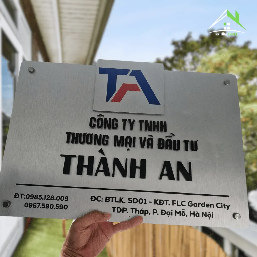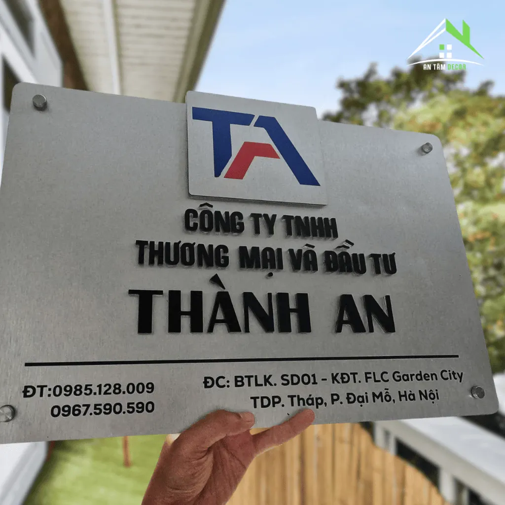 Biển sử dụng chất liệu inox xước bạc cao cấp, kết hợp in UV sắc nét và logo nổi sang trọng. Bề mặt chống trầy, chống gỉ sét, phù hợp môi trường ngoài trời và khu vực văn phòng.