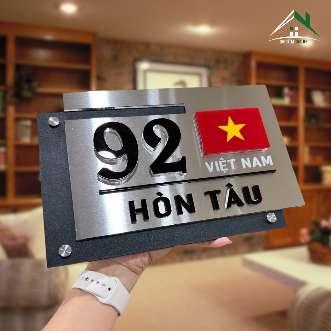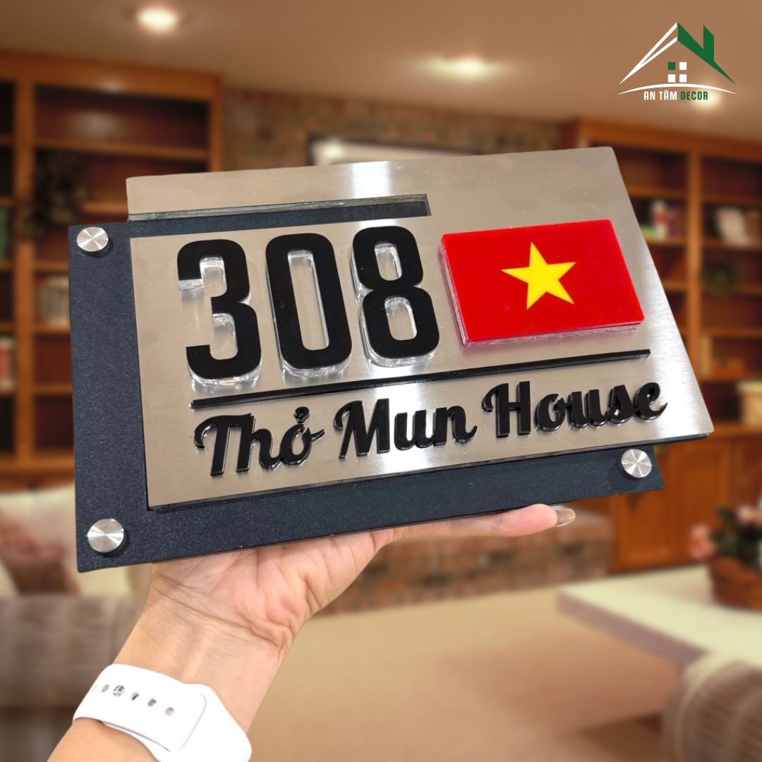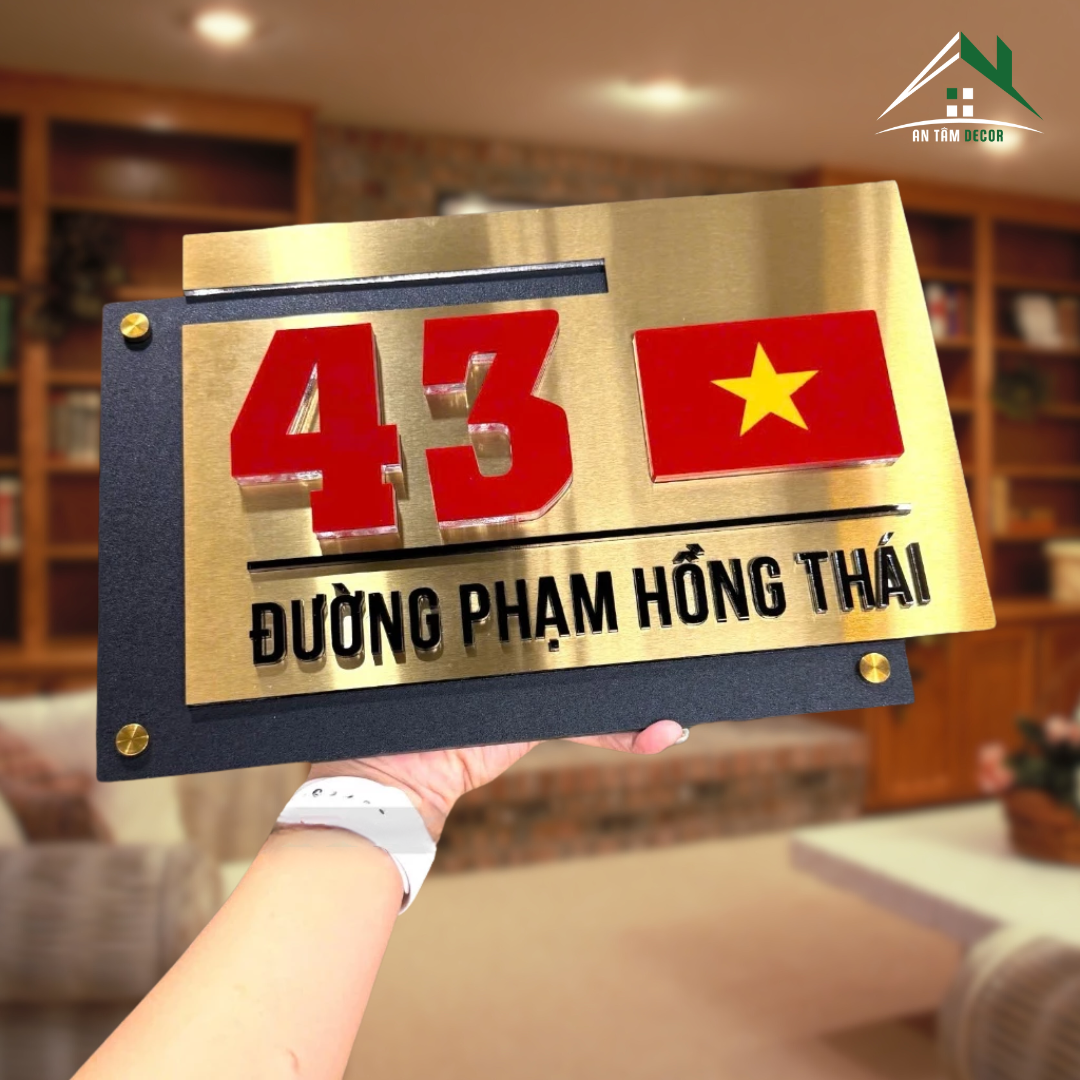 Biển Số Nhà Thiết Kế – Alu Đen Xước + Mica Vàng Nổi – Mẫu Sang Trọng Kèm Cờ Việt Nam