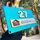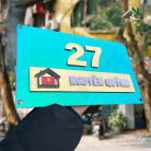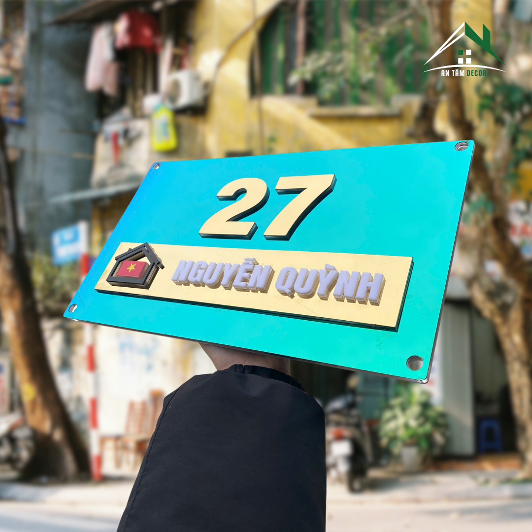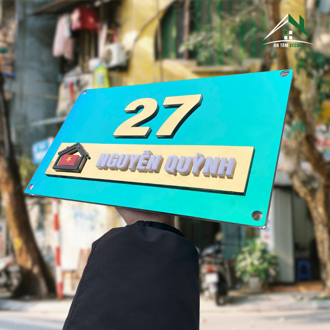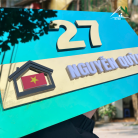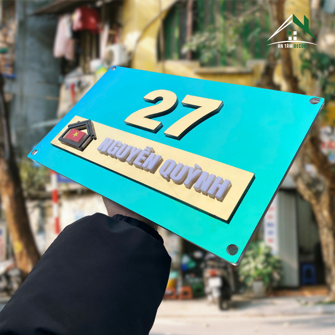 Thiết kế hiện đại, nổi bật với nền inox gương xanh độc đáo. Số nhà và chữ tên được làm dạng 3D nổi, tạo chiều sâu rõ ràng. Biểu tượng ngôi nhà kết hợp lá cờ Việt Nam mang ý nghĩa ấm áp, tự hào và gần gũi.