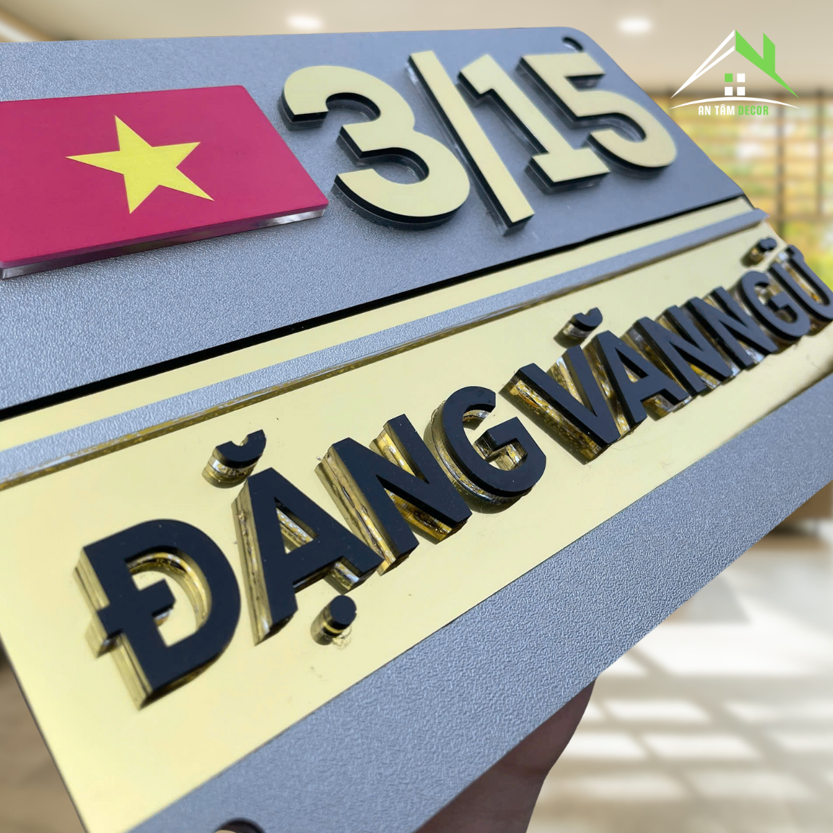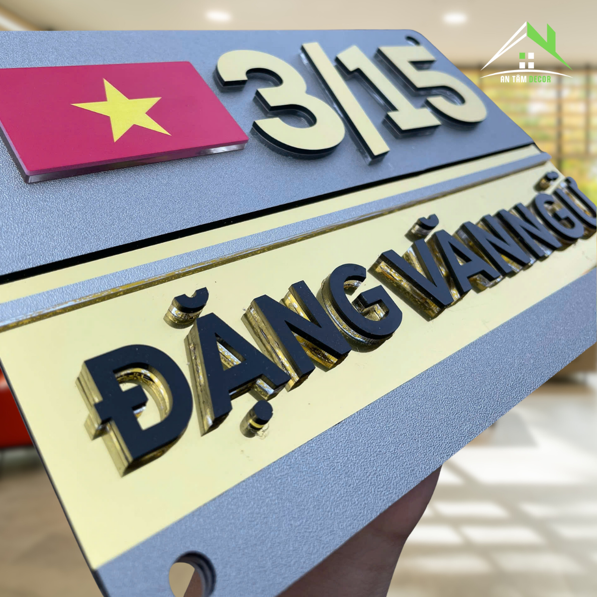 BIỂN SỐ NHÀ NGOÀI TRỜI – NỀN ALOCREST XƯỚC BẠC + VÀNG GƯƠNG, SỐ NỔI 5MM, CÓ IN LÁ CỜ VIỆT NAM