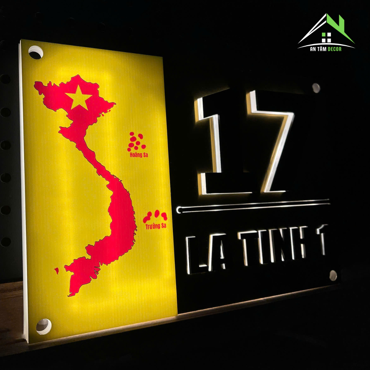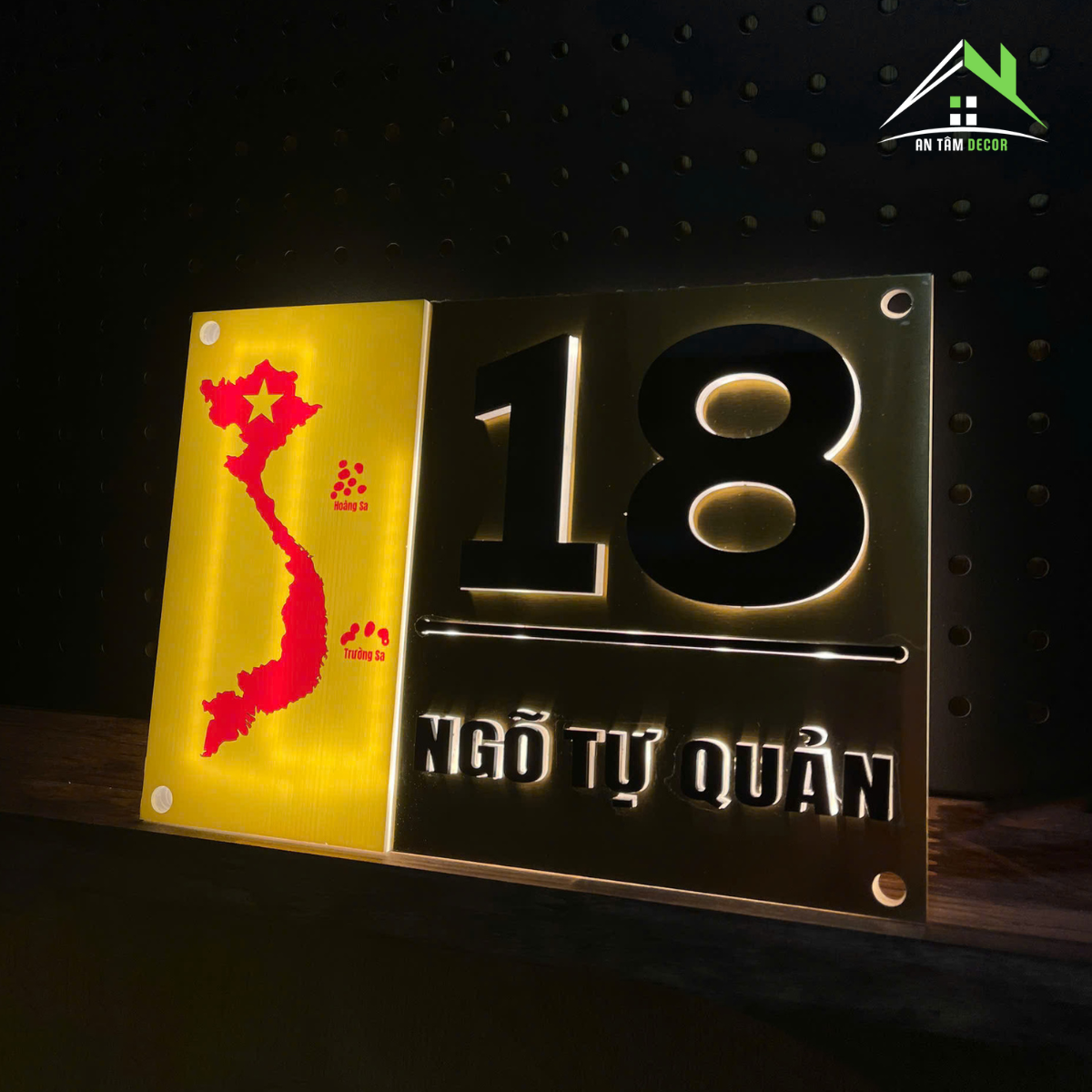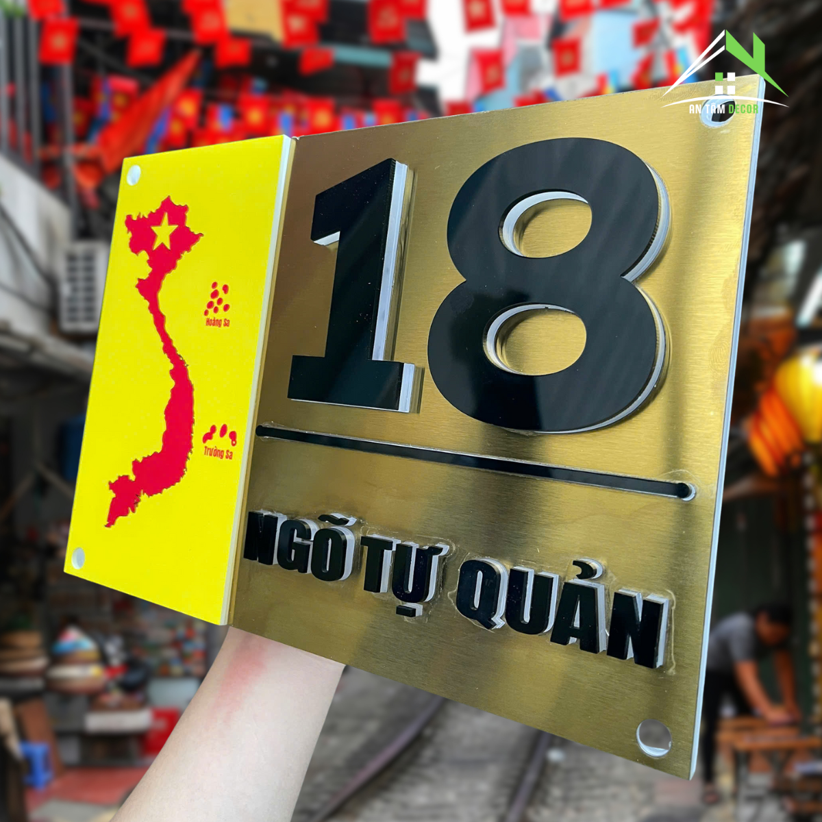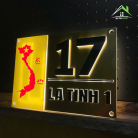 Biển số nhà được chế tác từ inox vàng gương cao cấp, sáng bóng, phản chiếu ánh sáng tự nhiên tạo hiệu ứng sang trọng. Phần bản đồ Việt Nam được in UV màu đỏ nổi bật trên nền vàng, thể hiện niềm tự hào dân tộc. Chữ và số được làm từ mica đen nổi 3D, cắt CNC tỉ mỉ cho độ sắc nét hoàn hảo.