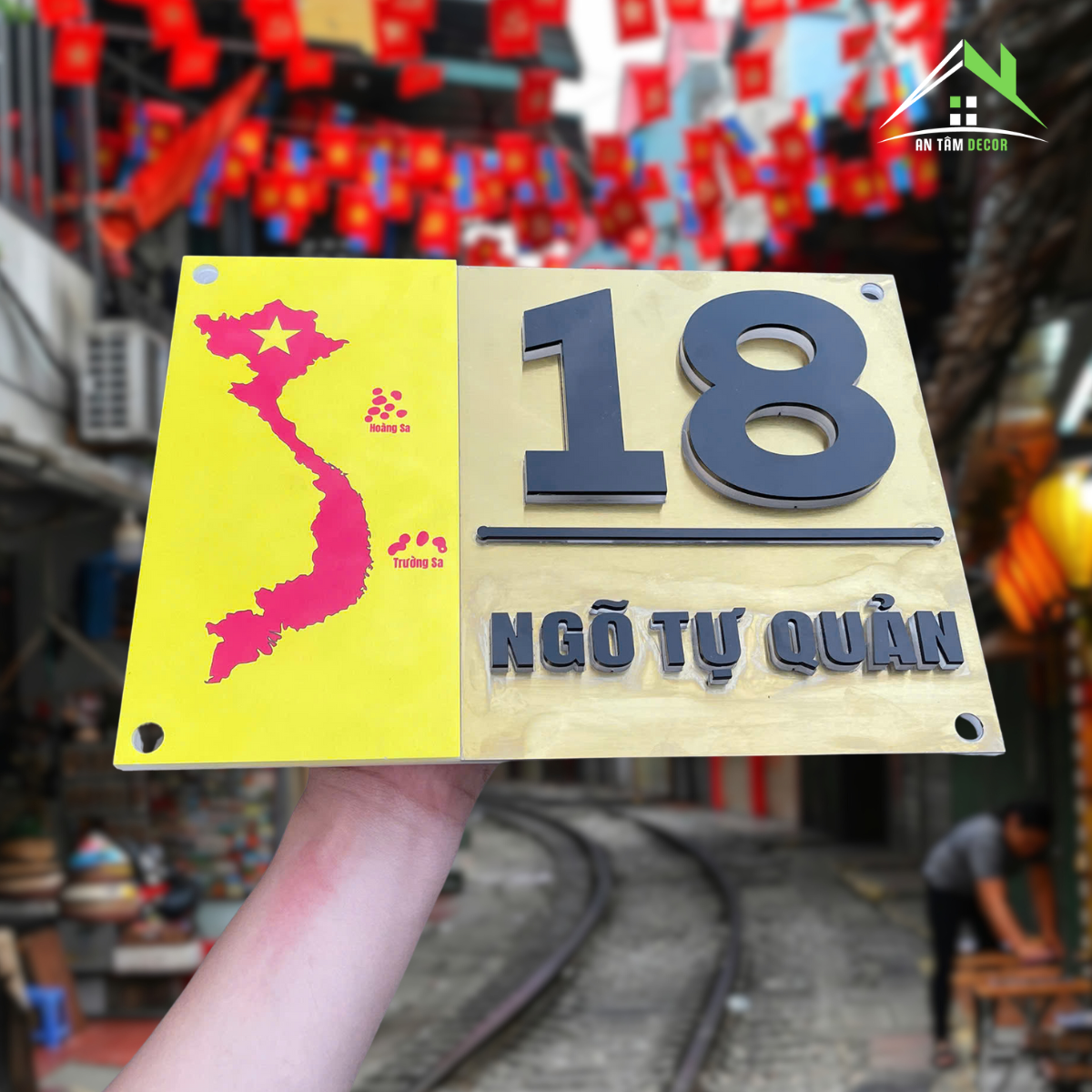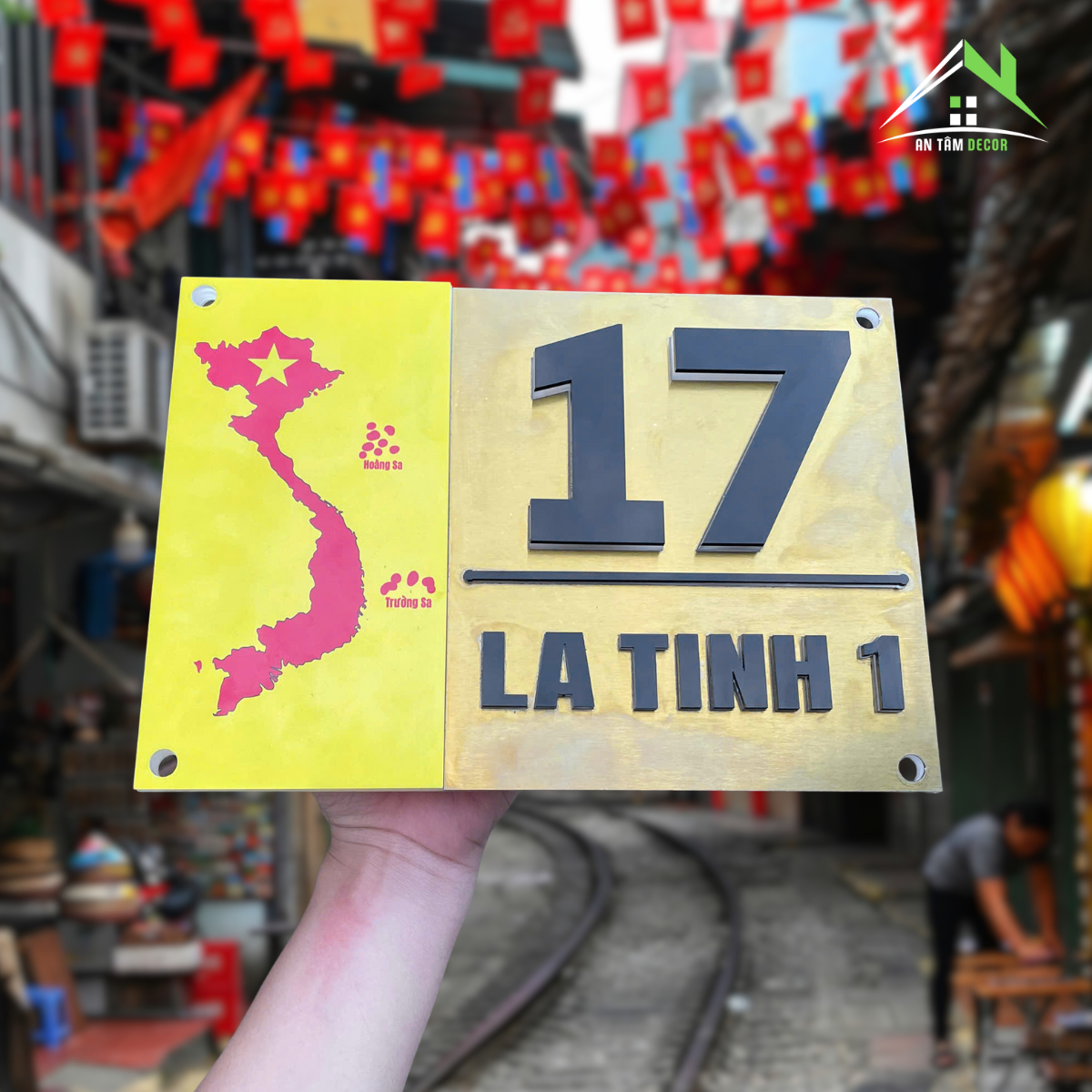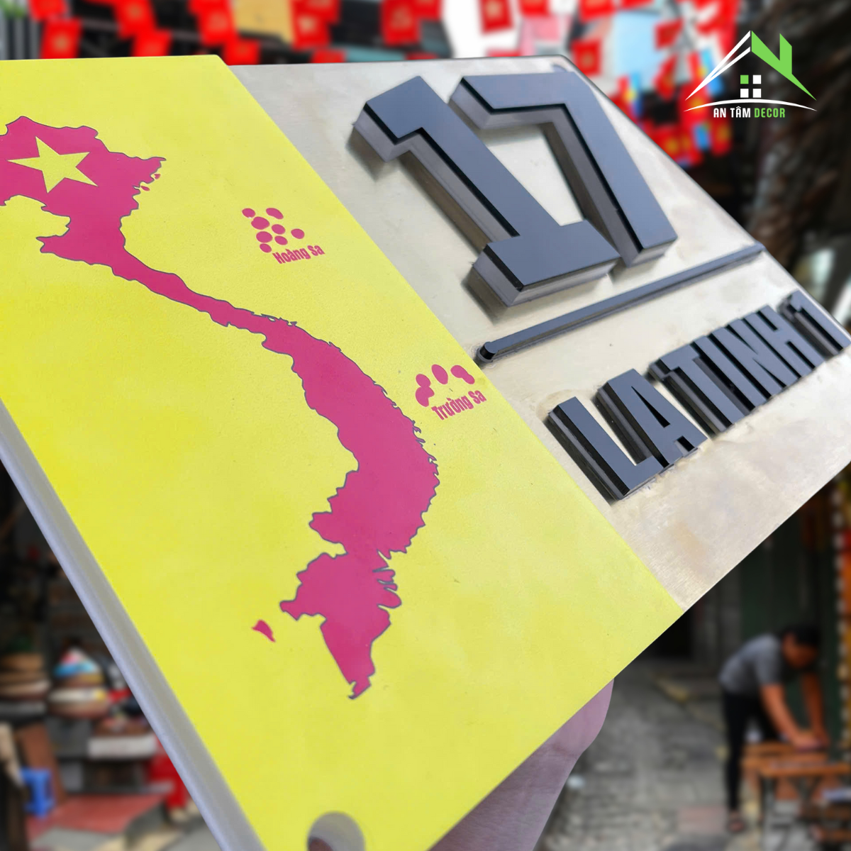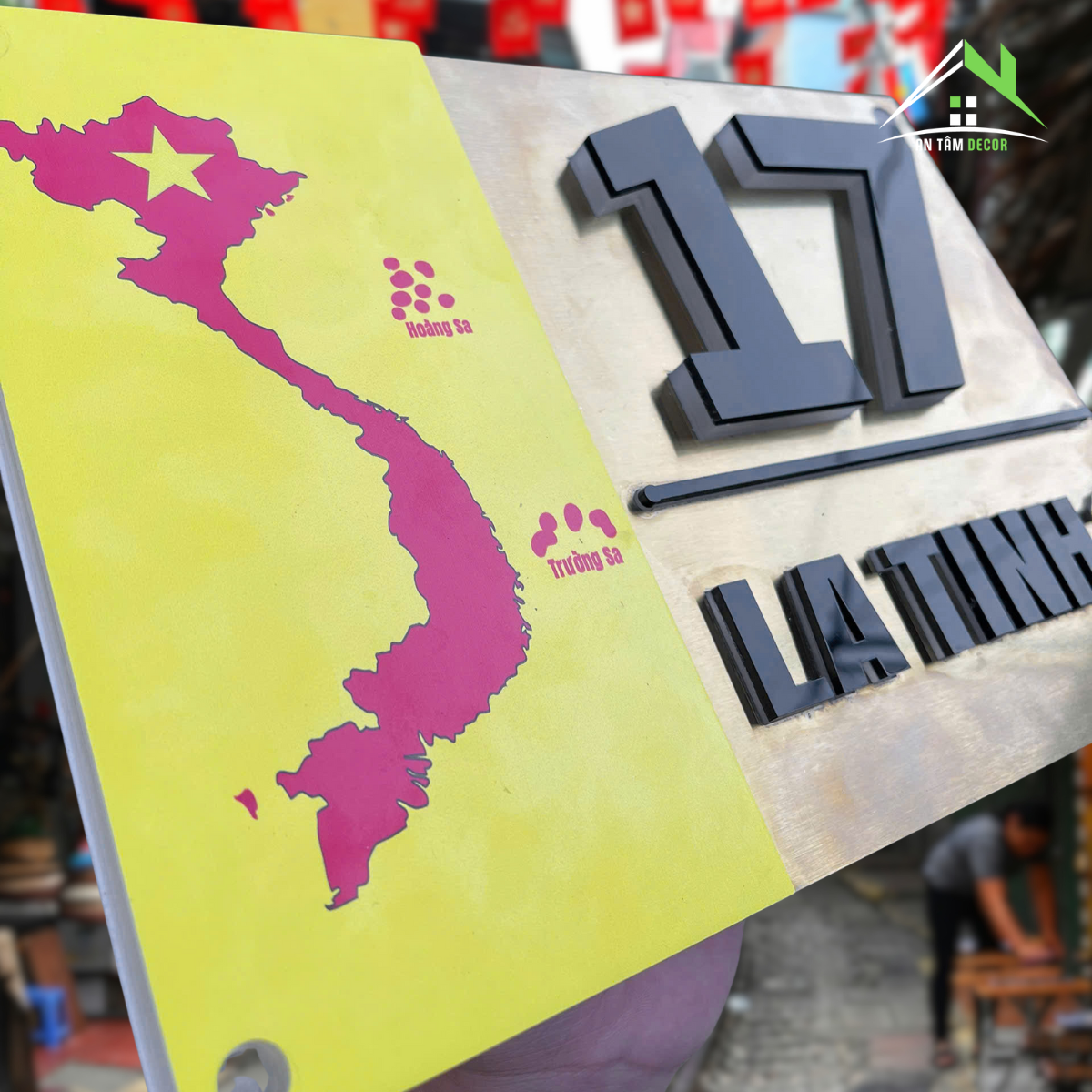Biển số nhà được chế tác từ inox vàng gương cao cấp, sáng bóng, phản chiếu ánh sáng tự nhiên tạo hiệu ứng sang trọng. Phần bản đồ Việt Nam được in UV màu đỏ nổi bật trên nền vàng, thể hiện niềm tự hào dân tộc. Chữ và số được làm từ mica đen nổi 3D, cắt CNC tỉ mỉ cho độ sắc nét hoàn hảo.