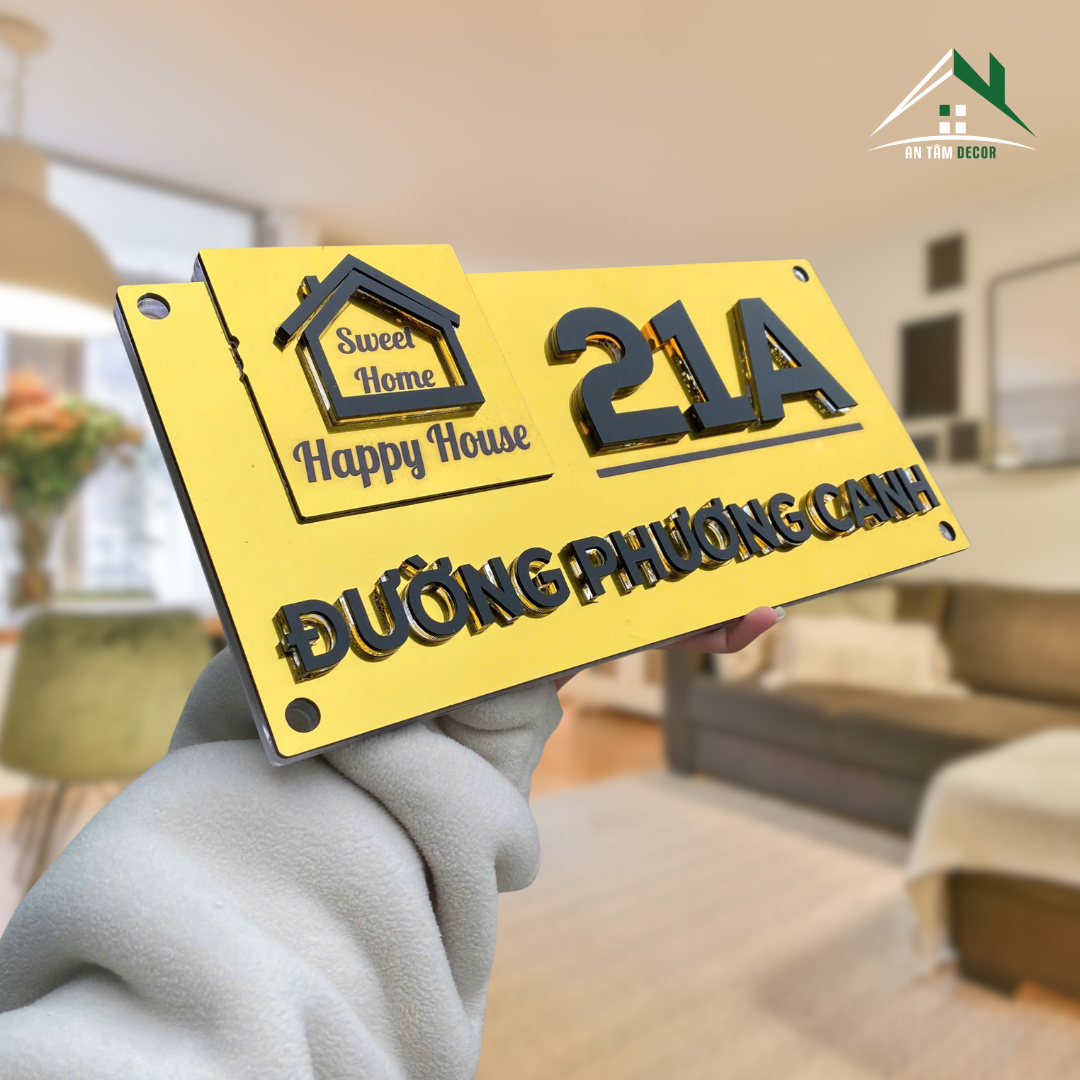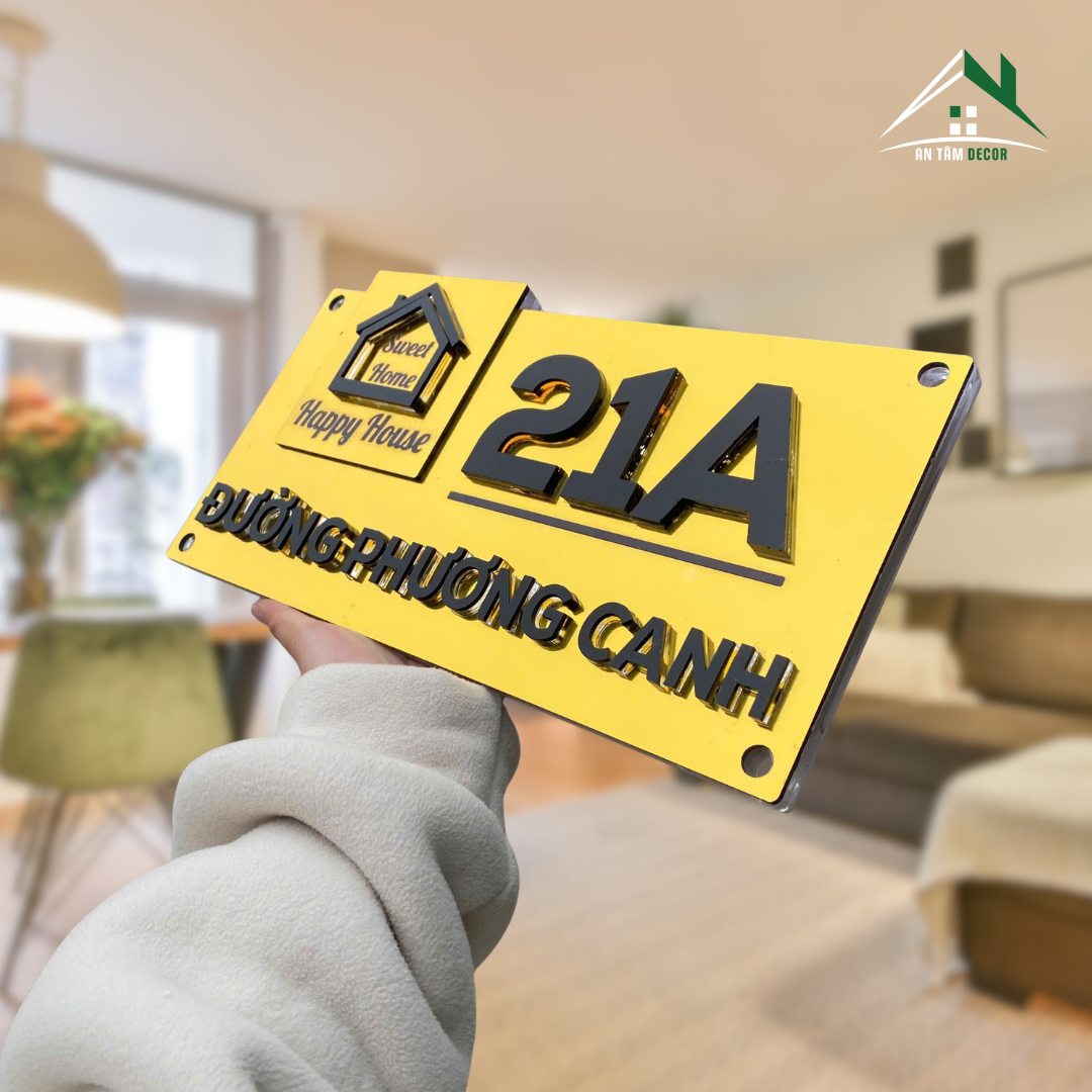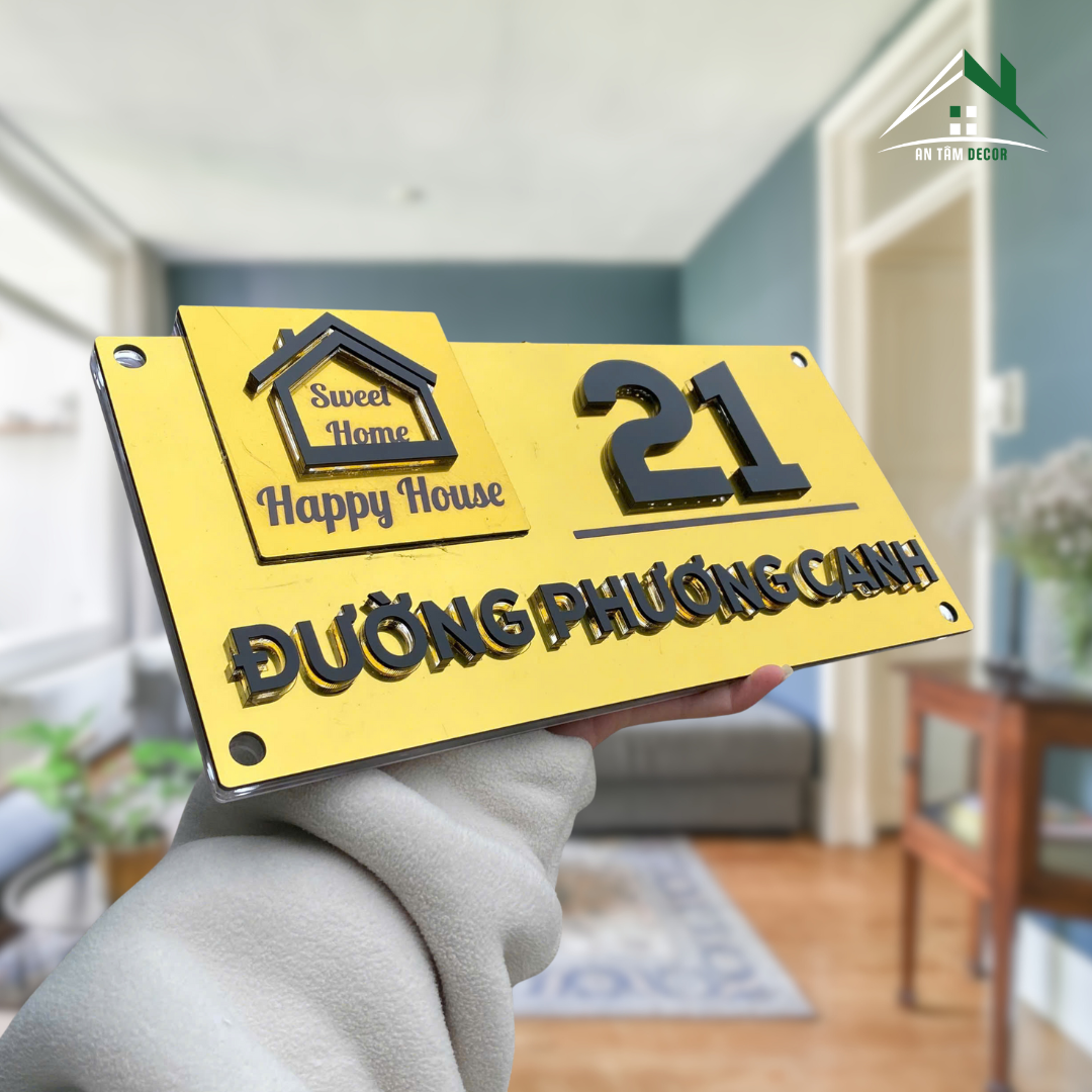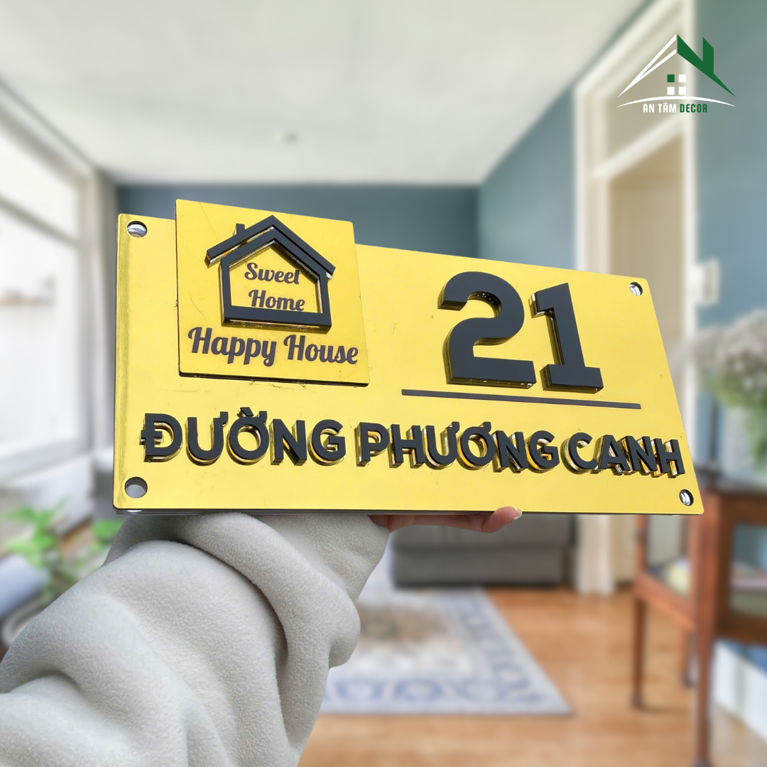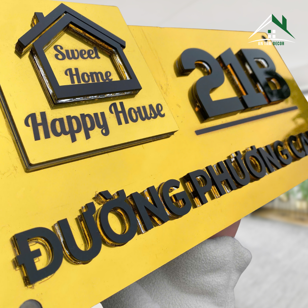 Tùy chỉnh nội dung số nhà, tên nhà, câu chữ trang trí (ví dụ: Happy House, Sweet Home…), bố cục và kích thước theo yêu cầu.