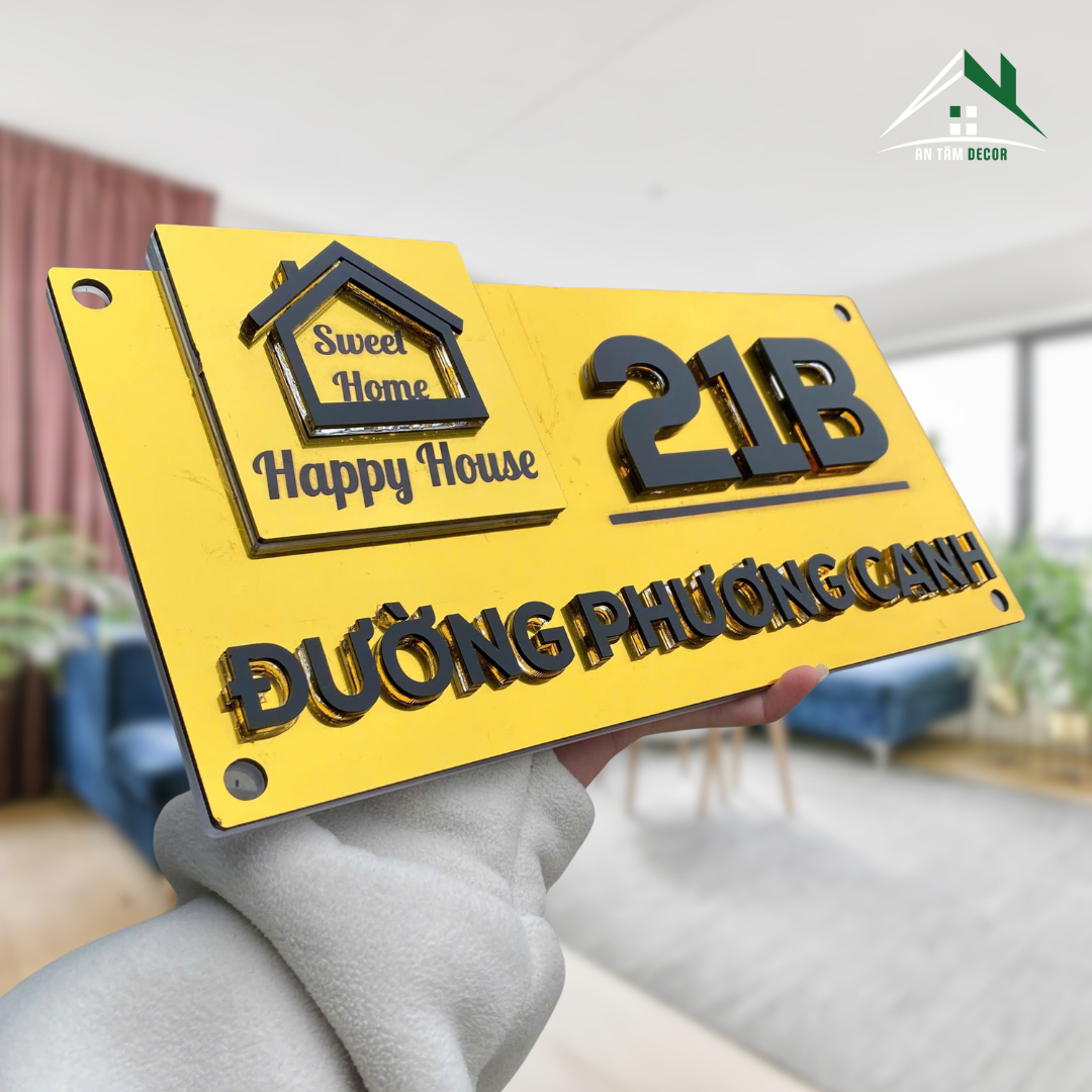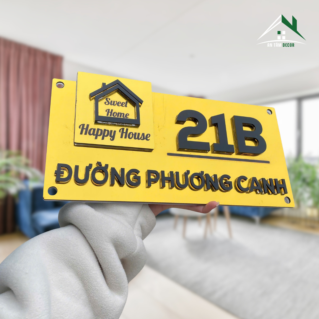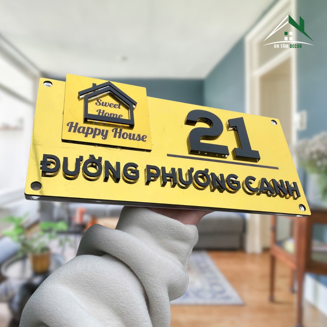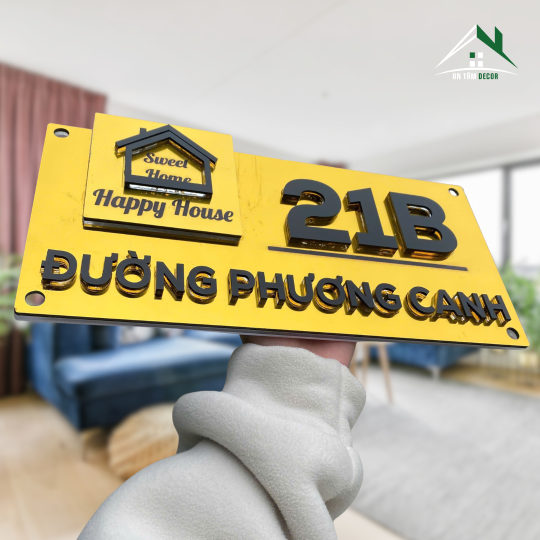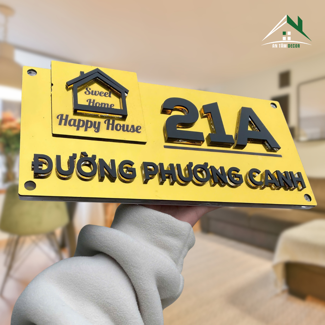 Tùy chỉnh nội dung số nhà, tên nhà, câu chữ trang trí (ví dụ: Happy House, Sweet Home…), bố cục và kích thước theo yêu cầu.