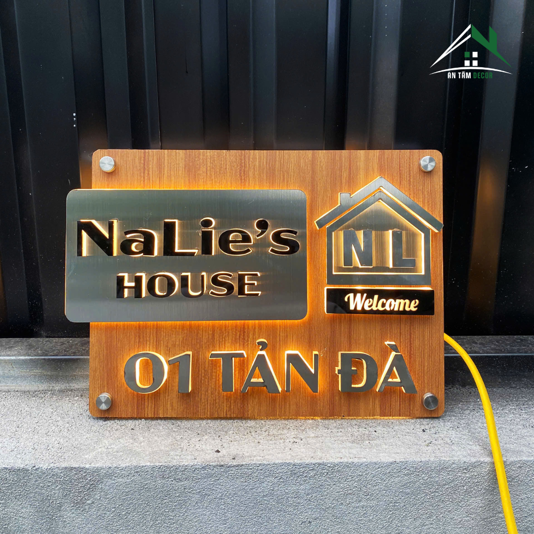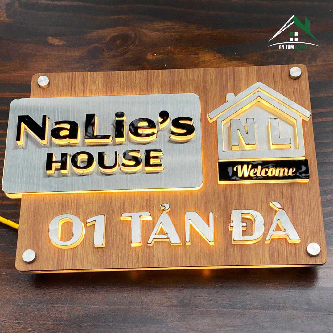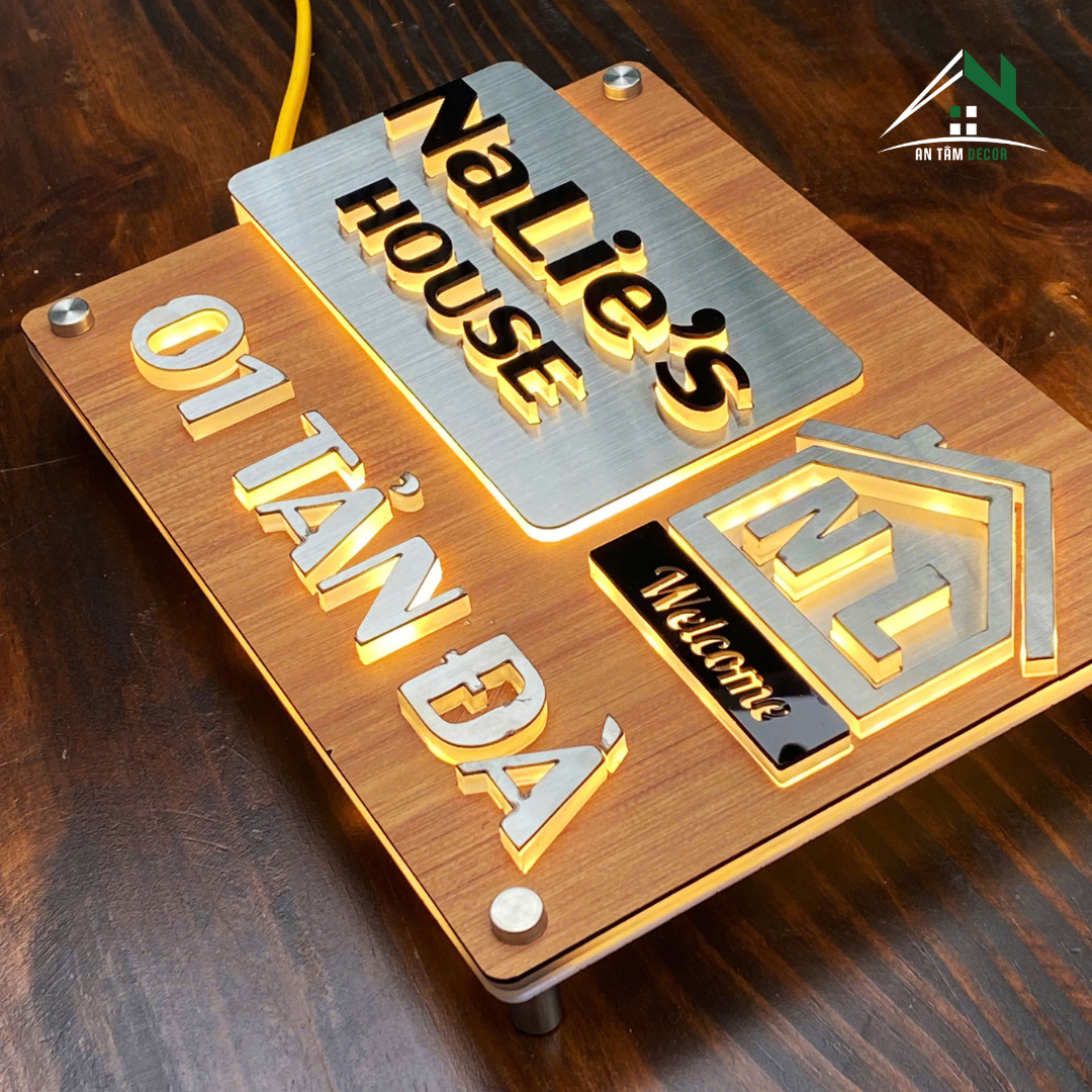 Biển Số Nhà Inox Xước Bạc Kết Hợp Alu Vân Gỗ – Chữ 3D Nổi Led Vàng – Thiết Kế Sang Trọng Hiện Đại