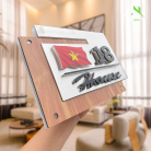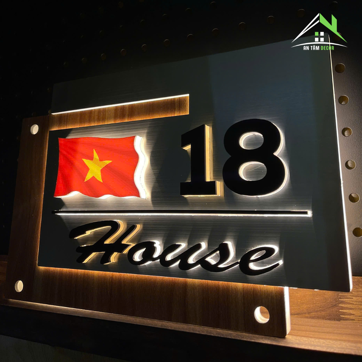 Biển số nhà LED nền gỗ kết hợp inox xước bạc, tạo nên vẻ đẹp hiện đại và sang trọng. Thiết kế nổi bật với chi tiết quốc kỳ Việt Nam, số nhà 3D và đèn LED chiếu sáng tinh tế, mang lại điểm nhấn độc đáo cho không gian sống.