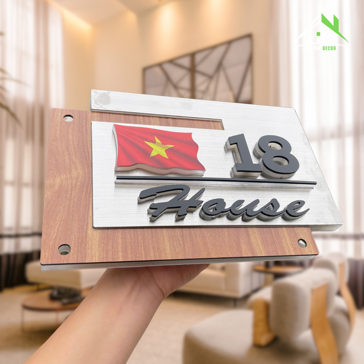Màu sắc: Nền gỗ nâu vân gỗ, INOX bạc xước, số nhà biểu tượng nổi bật
