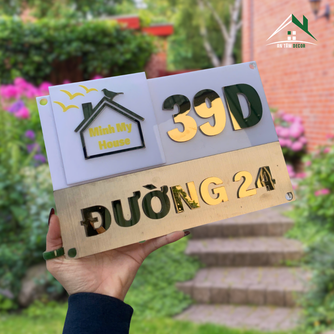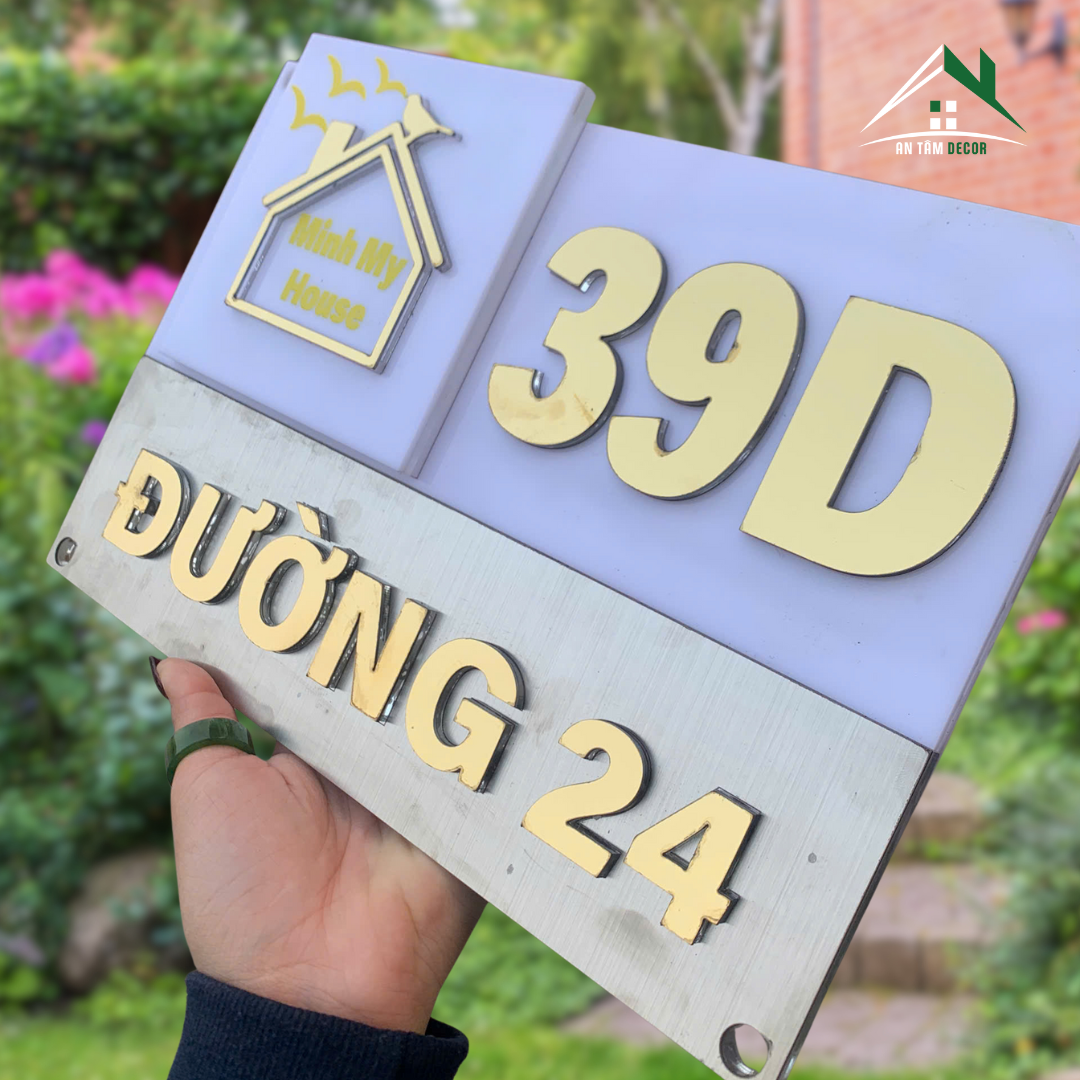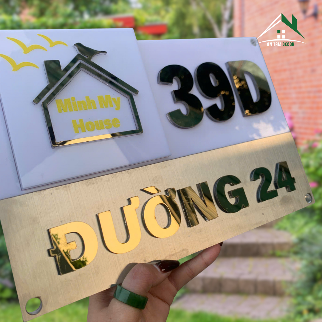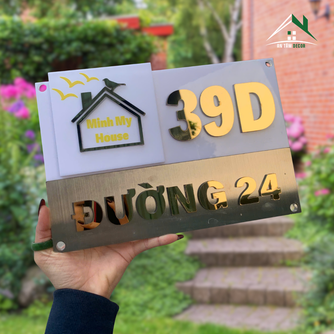 Tùy chỉnh nội dung số nhà, tên đường, tên nhà (ví dụ: Minh My House), logo hoặc biểu tượng theo yêu cầu. Có thể thay đổi màu chữ, tỷ lệ bố cục và kích thước tổng thể.