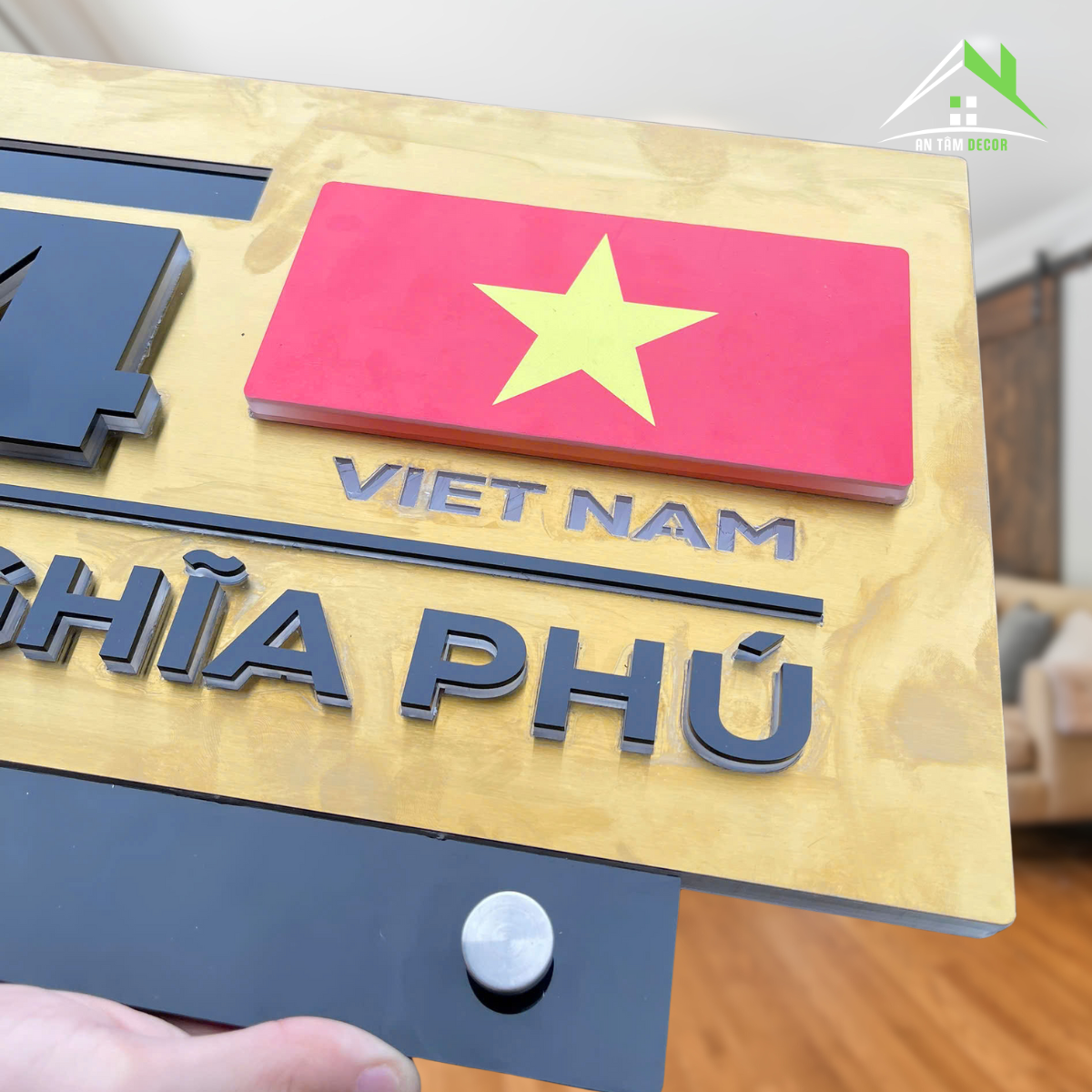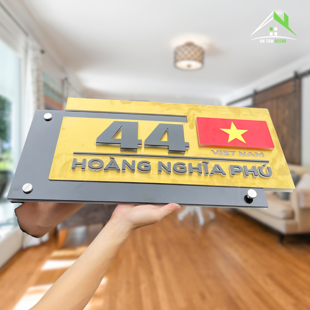 BIỂN SỐ NHÀ NGOÀI TRỜI – NỀN ALOCREST XƯỚC BẠC + VÀNG GƯƠNG, SỐ NỔI 5MM, CÓ IN LÁ CỜ VIỆT NAM