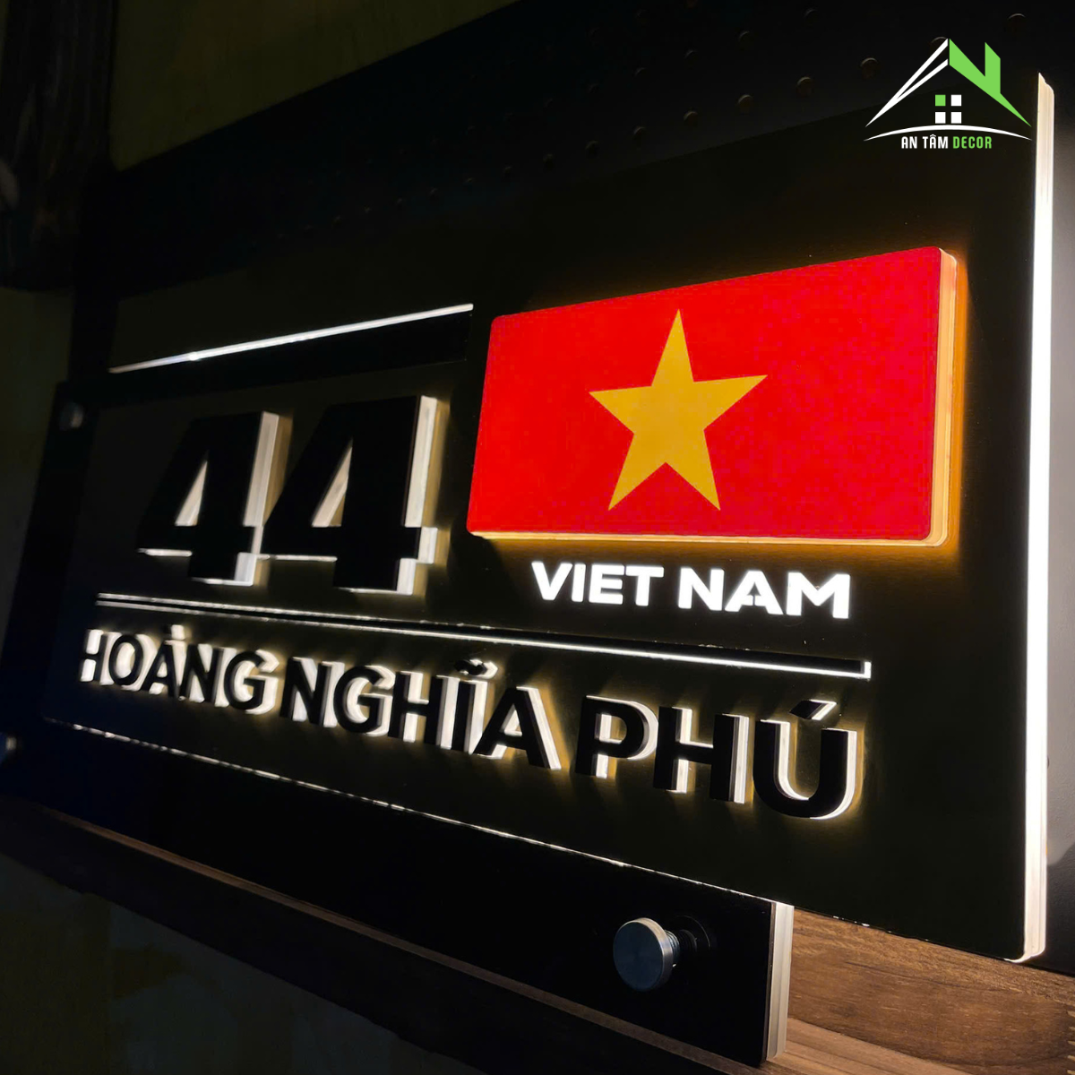 Biển số nhà inox nền vàng kết hợp cờ Việt Nam nổi mang phong cách hiện đại, sang trọng và đầy tinh thần dân tộc. Thiết kế nổi bật với số nhà rõ ràng, dễ nhìn cả ngày lẫn đêm nhờ hệ thống đèn LED chiếu sáng.